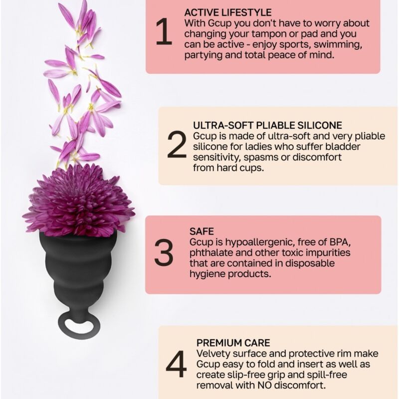 La principal ventaja e innovación de la Gcup es la estructura interna. En el interior del recipiente hay una válvula de retención que evita que se escape el líquido. La copa menstrual Gcup tiene forma de campana, lo que facilita su uso.